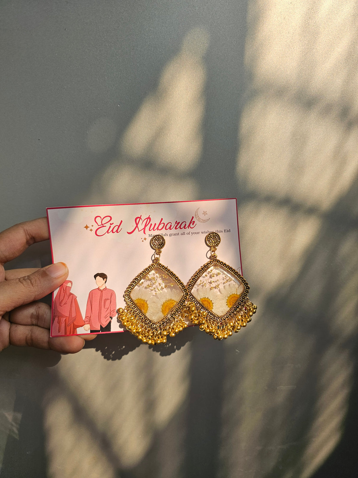 Set in a square silhouette, the design adds structure and modern charm, while golden flakes bring a subtle glow—adding richness, warmth, and a hint of royalty without overpowering the softness of the daisy.This pair is not loud.