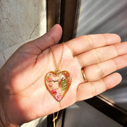 ✔️ Transparent resin heart pendant with real pink flowers & leaf