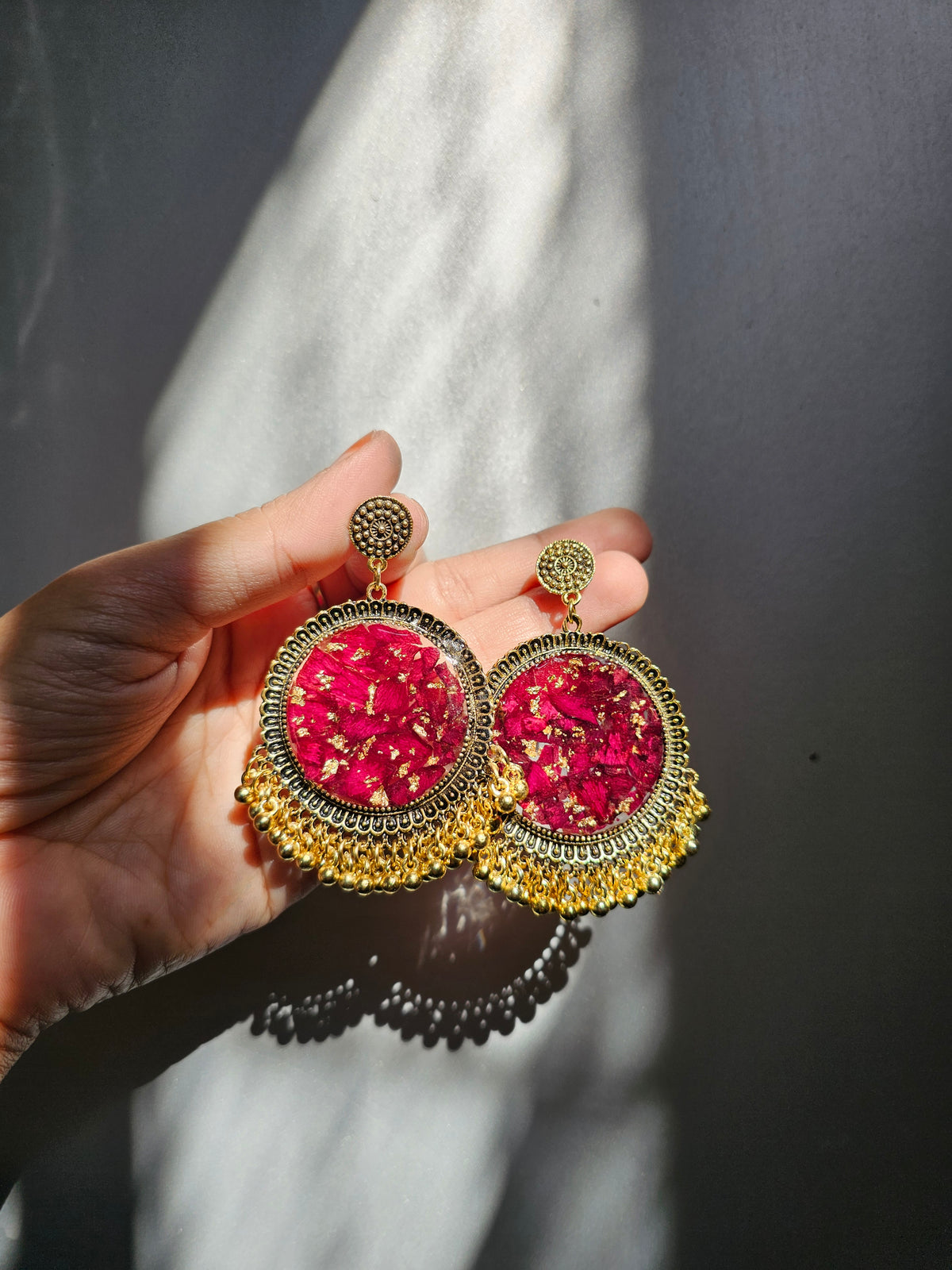 handmade with real rose petals ,every jhumka is unique as every flower petals has unique color ,  dark red to wine color petals used in every jhumka.