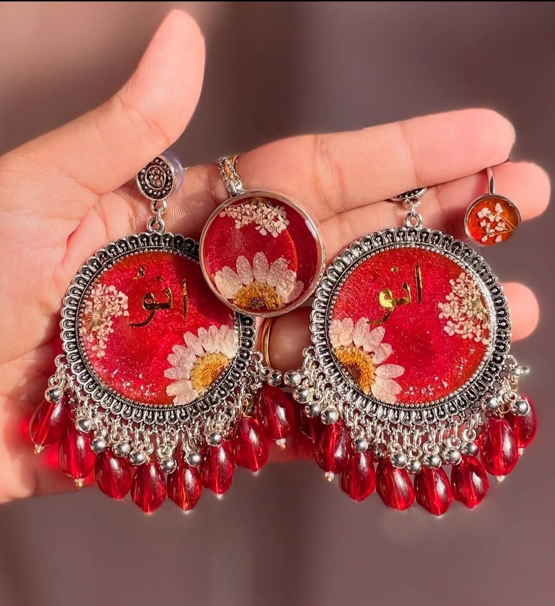 Introducing our enchanting complete jewelry set featuring a beautifully crafted silver jhumka with a vibrant red base, adorned with real daisy and Anne's lace flowers. The jhumka also features a personalized couple’s name, adding a unique touch to this elegant set. This set includes a matching ring and pendant, each piece meticulously designed to capture the delicate beauty of nature. Ideal for weddings, anniversaries, and special occasions, this set effortlessly blends traditional charm with contemporary elegance.