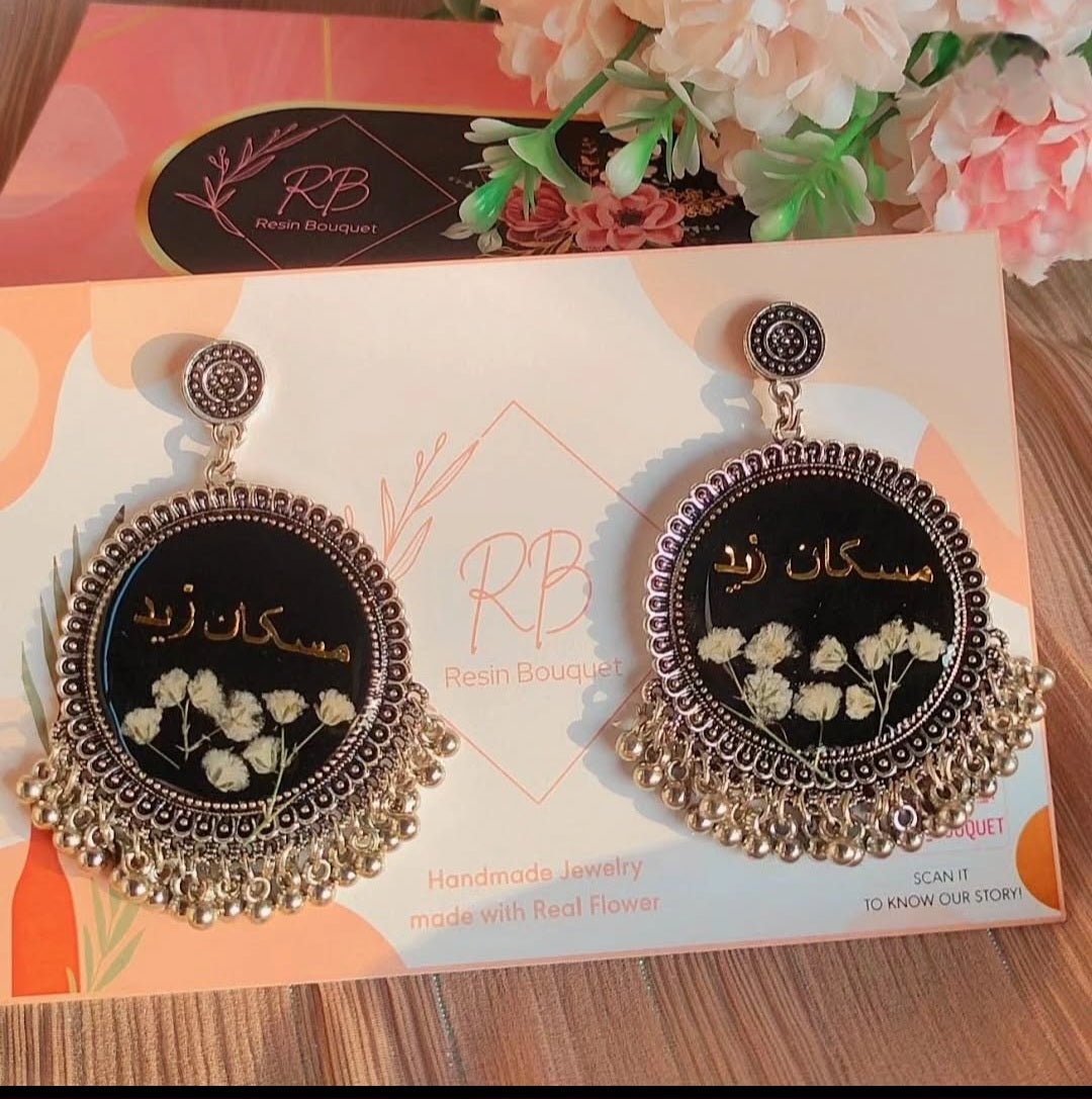 These beautiful jhumkas are made from real Baby's Breath flowers and carefully preserved in resin. For added customization, a couple's name or any desired name can be added, making each pair of earrings uniquely personal.