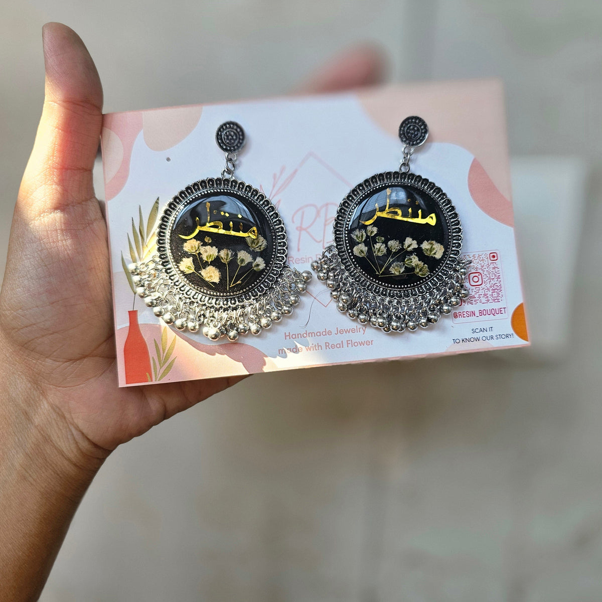 We specialize in handcrafted resin jewelry, including jhumkas, rings, hoops, necklaces, bracelets, bridal jewelry, and custom name jewelry.