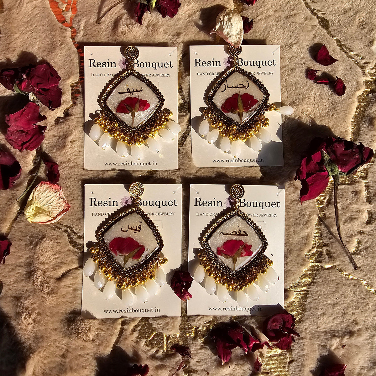 Add a touch of elegance and uniqueness to your jewelry collection with our Personalized Resin Rose Jhumka. Crafted with intricate detailing, these stunning jhumkas feature a delicate resin rose at the top, complemented by shimmering white crystal pearls for a timeless appeal.